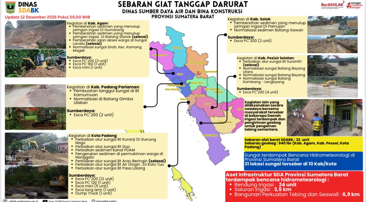 Padang, Sumatera Barat [DESA MERDEKA] Pemerintah Provinsi Sumatera Barat (Pemprov Sumbar) secara masif mempercepat penanganan dampak bencana hidrometeorologi, seperti banjir bandang dan longsor, yang melanda sejumlah daerah sejak penetapan status tanggap darurat bencana tingkat provinsi pada 25 November 2025. Hingga saat ini, Pemprov Sumbar melalui Dinas Sumber Daya Air dan Bina Konstruksi (SDABK) telah mengerahkan total 35 unit alat berat dan memasang 940 geobag di berbagai lokasi terdampak.